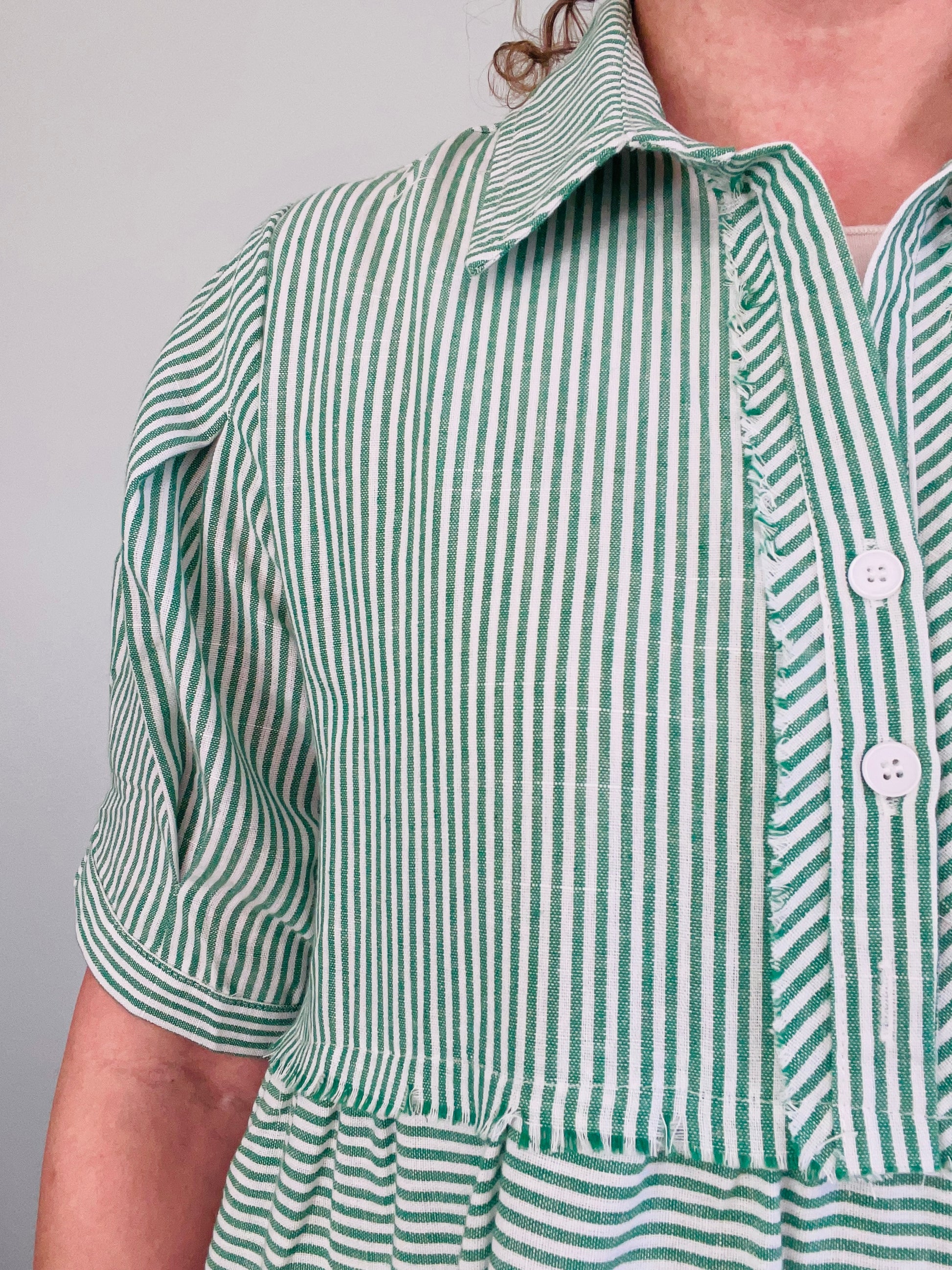 Hello Jade! This gorgeous dress is made from a jade green and white striped 100% cotton fabric. The breezy dress will be the perfect go to for the upcoming summer months! Available in sizes S - 3XL.