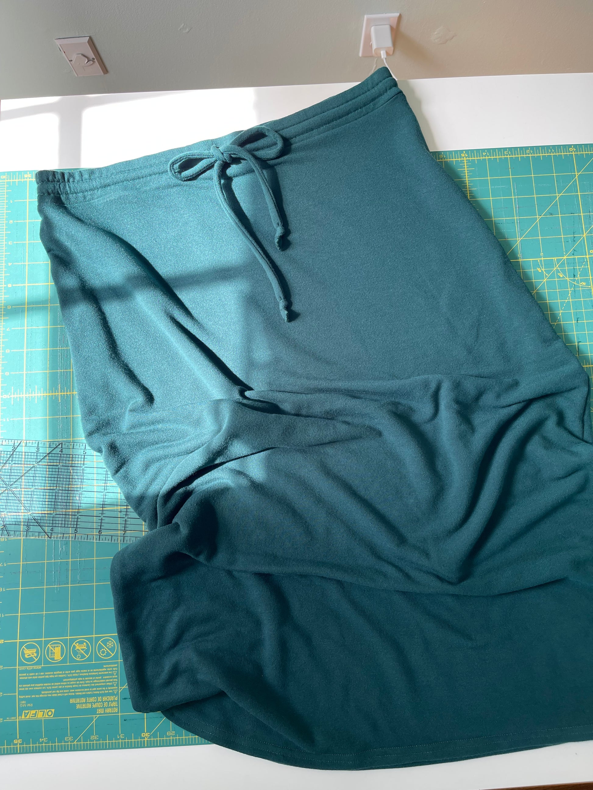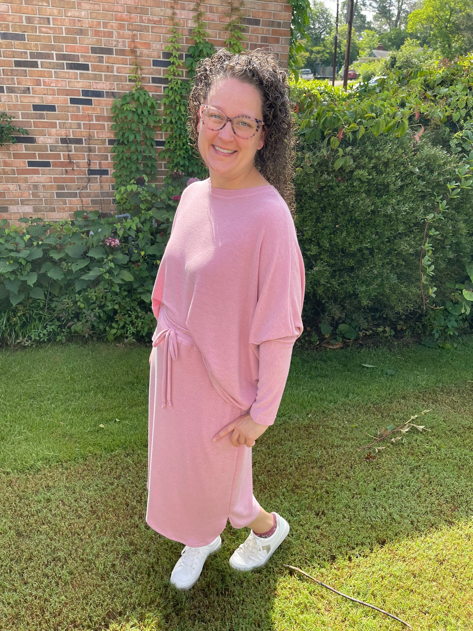 Em's travel set is made from the softest, dreamiest French Terry fabric. The skirt is midi-length and has an elastic waistband with a drawstring tie. The top is an oversized bat wing top with long cuffs from elbow to wrist. Both pieces are relaxed fit. This is a PREORDER.