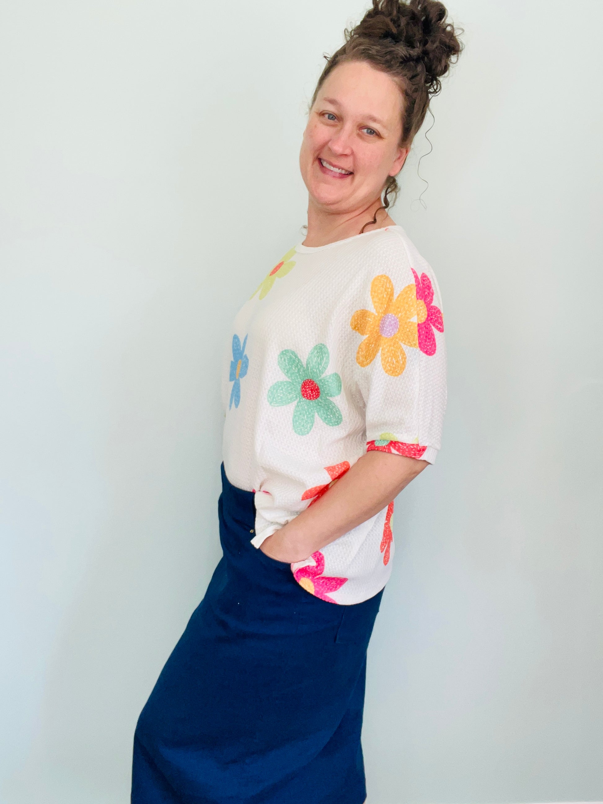 This adorable top is full of charm! Colorful daisies fill a white background on this soft waffle weave fabric. Available in sizes S - 3XL. Made in a tunic style with dolman sleeves stopping right above the elbow. This top is oversized!!!